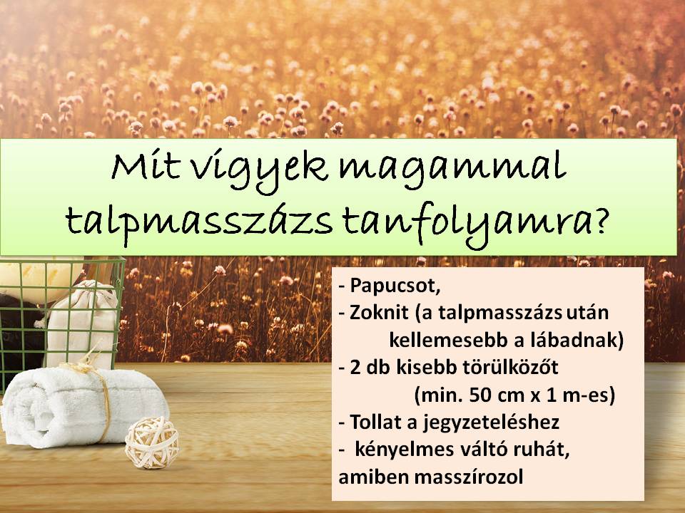 Tanfolyam időtartama:  Egy óra 45 perces .Elsősorban a gyakorlatra helyezzük a hangsúlyt. A tanfolyam végére képes leszel egy 30-45 perces teljes frissítő talpmasszázs kezelés végzésére.